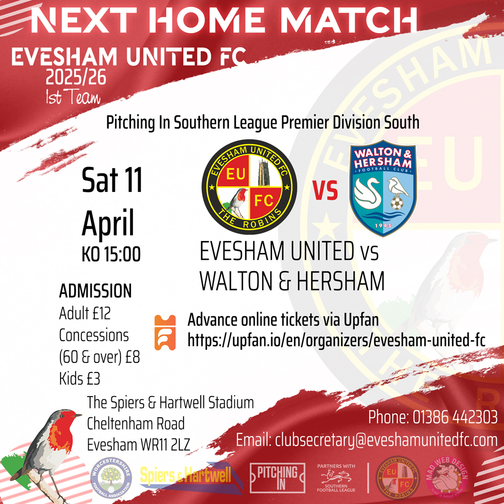 Evesham United vs Walton & Hersham Thursday 9th April 2026 Pitching In Southern League Premier South This Saturday, Evesham United welcome the newly crowned champions of the Southern League Premier South, Walton & Hersham, to the Spiers & Hartwell Stadium. The results on Easter [...]