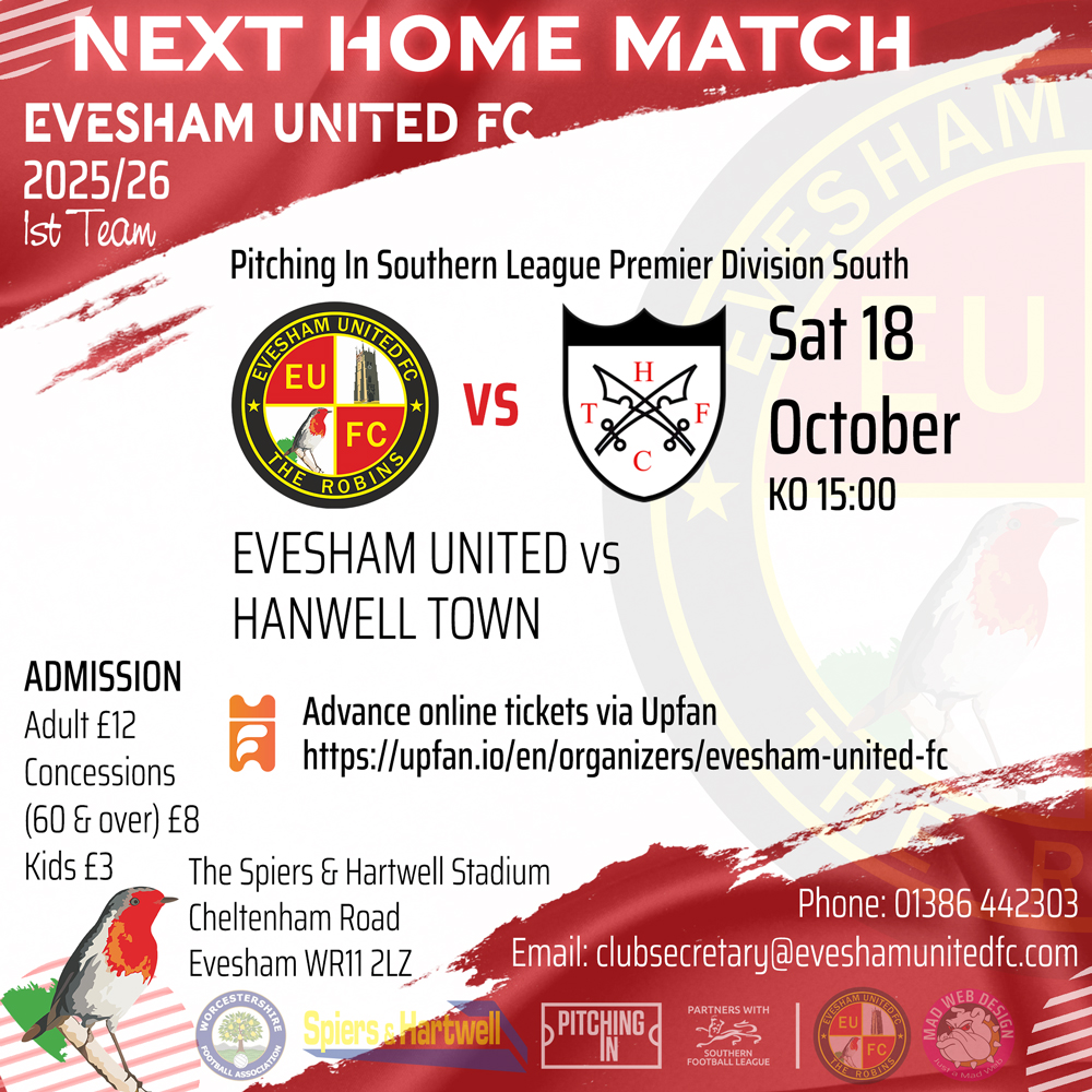 There are several matches for Evesham this pre-season, firstly against Cheltenham Town with the kick-off being brought forward half an hour to 19:00 (home, Friday 12th July, 19:00), Pershore Town (away, Tuesday 16th July, 19:30), Inkberrow (away, Saturday 20th July, 15:00), Redditch United (home, Tuesday 23rd July, 19:30), Swindon Supermarine (away, Saturday 27th July, 15:00), Forest Green Rovers (home, Wednesday 31st July, 19:00) and North Leigh (home, Saturday 3rd August 13:00) before the Southern League season gets underway on Saturday 10th August.