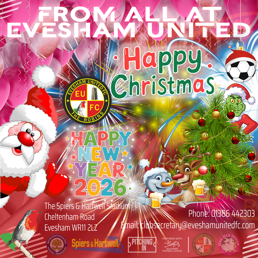 Our First team manager, Mike Ford, commented, “I’d like to wish all our fantastic supporters, volunteers, and everyone connected with Evesham United a very Happy Christmas and a wonderful New Year.