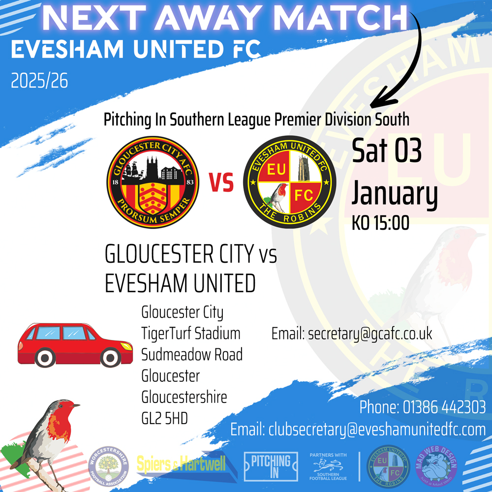 There is a 53 seater supporters coach leaving Evesham United at 13:00 promptly. Bookings can be made via email to: clubsecretary@eveshamunitedfc.com. The cost is Adults £15 U16s £5 Cash on the day. The coach leaves Gloucester City FC at 17:30 and arrives at Evesham United at 18:15.