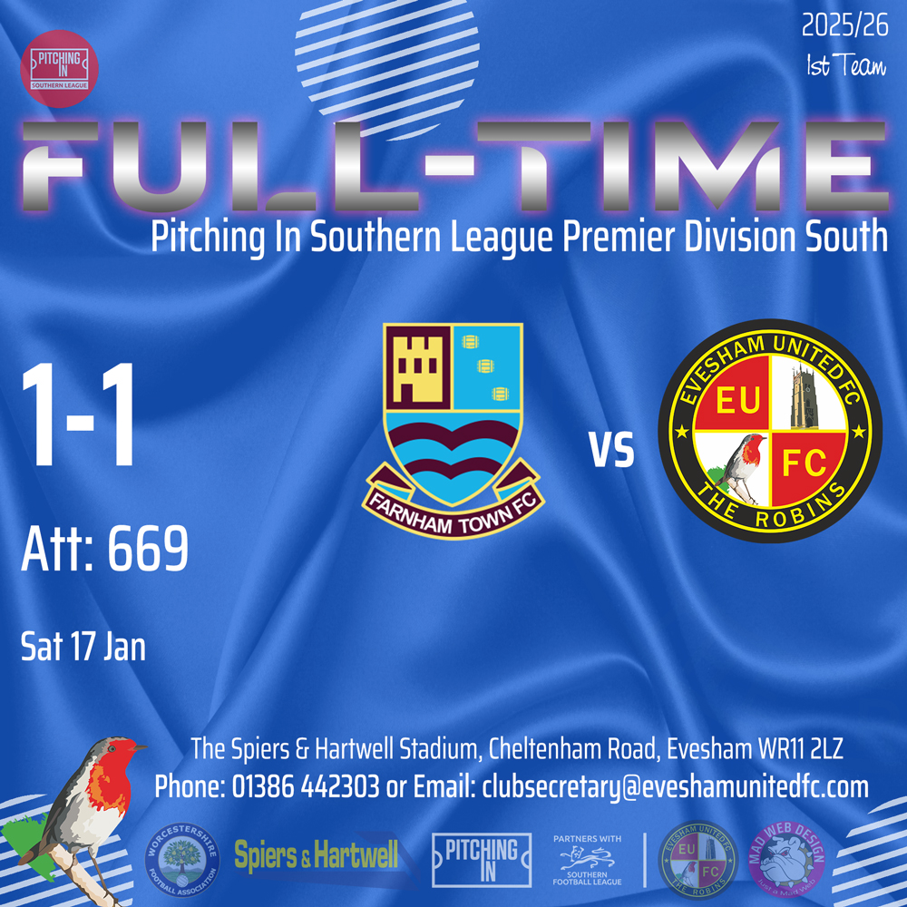 Farnham Town 1-1 Evesham United Monday 19th January 2026 Pitching In Southern League Premier South Match Report by Simon Purfield Evesham United’s journey to Surrey resulted in a hard-fought draw against Farnham Town, who are in contention for a playoff spot. In front of [...]