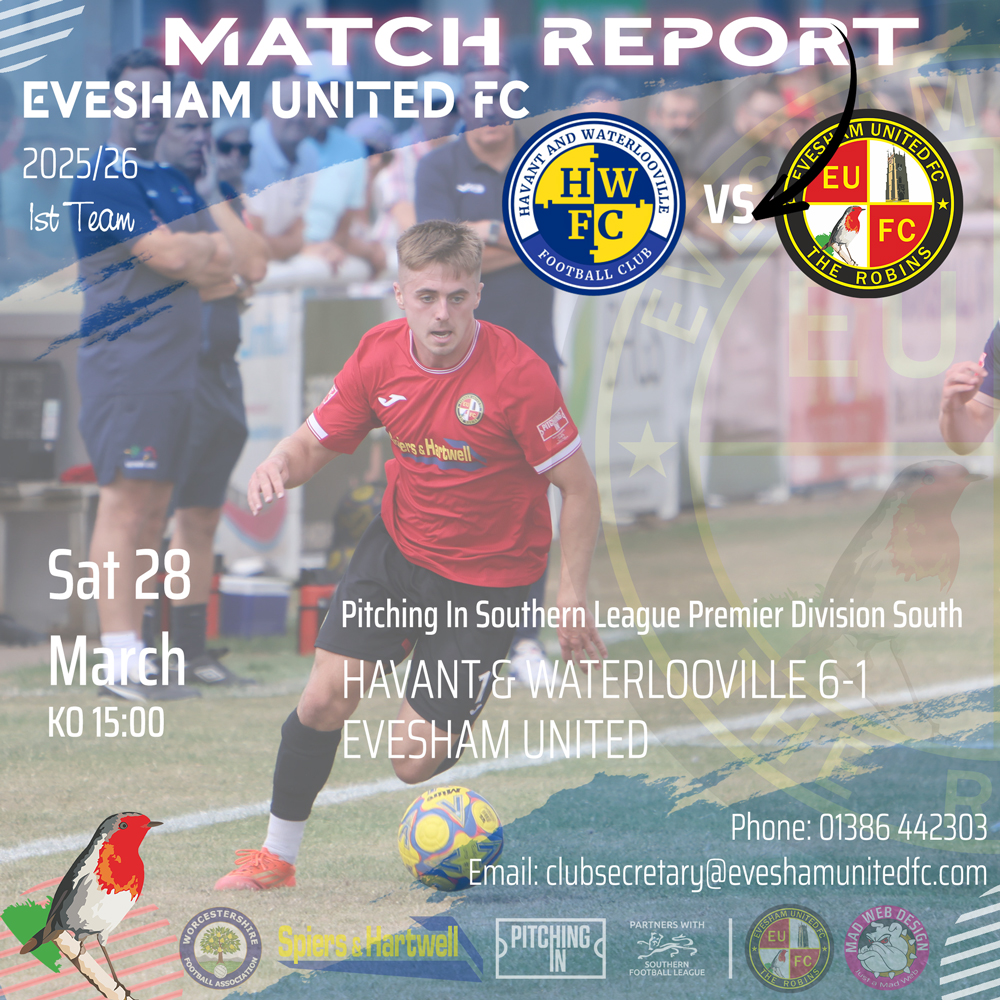 Havant & Waterlooville 6-1 Evesham United Monday 30th March 2026 Pitching In Southern League Premier South Match Report by Simon Purfield Evesham made the trip to the south coast on Saturday to take on Havant and Waterlooville and came away with their biggest defeat [...]